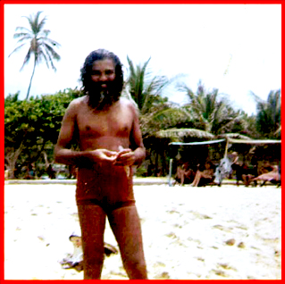 BABAJI spent much time at the beach in prayer, teaching students, and taking exercise through swimming. Throughout his life BABAJI has stressed to all his students, the importance of exercise to maintain one's general health and well-being. In fact at the time this photograph was taken, BABAJI had been fasting for close to six years on only shelled peanuts and fruits.